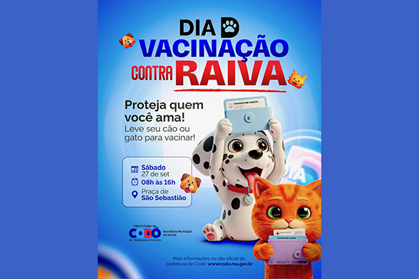 A Prefeitura Municipal de Codó, por meio da Secretaria Municipal de Saúde, promoverá neste sábado, 27 de setembro, o DIA D da Vacinação contra a Raiva, uma ação que reforça o compromisso do município no combate à raiva animal e na proteção da saúde pública.