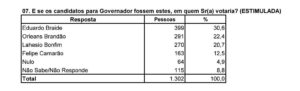 O terceiro lugar é o ex-prefeito de São Pedro dos Crentes, Lahesio Bonfim (Novo), com 20,7%; e o quarto colocado é o vice-governador Felipe Camarão (PT), que tem 12,5%. Percentual de 4,9% disse que votaria nulo e de 8,8% que não sabia ou não quis opinar.