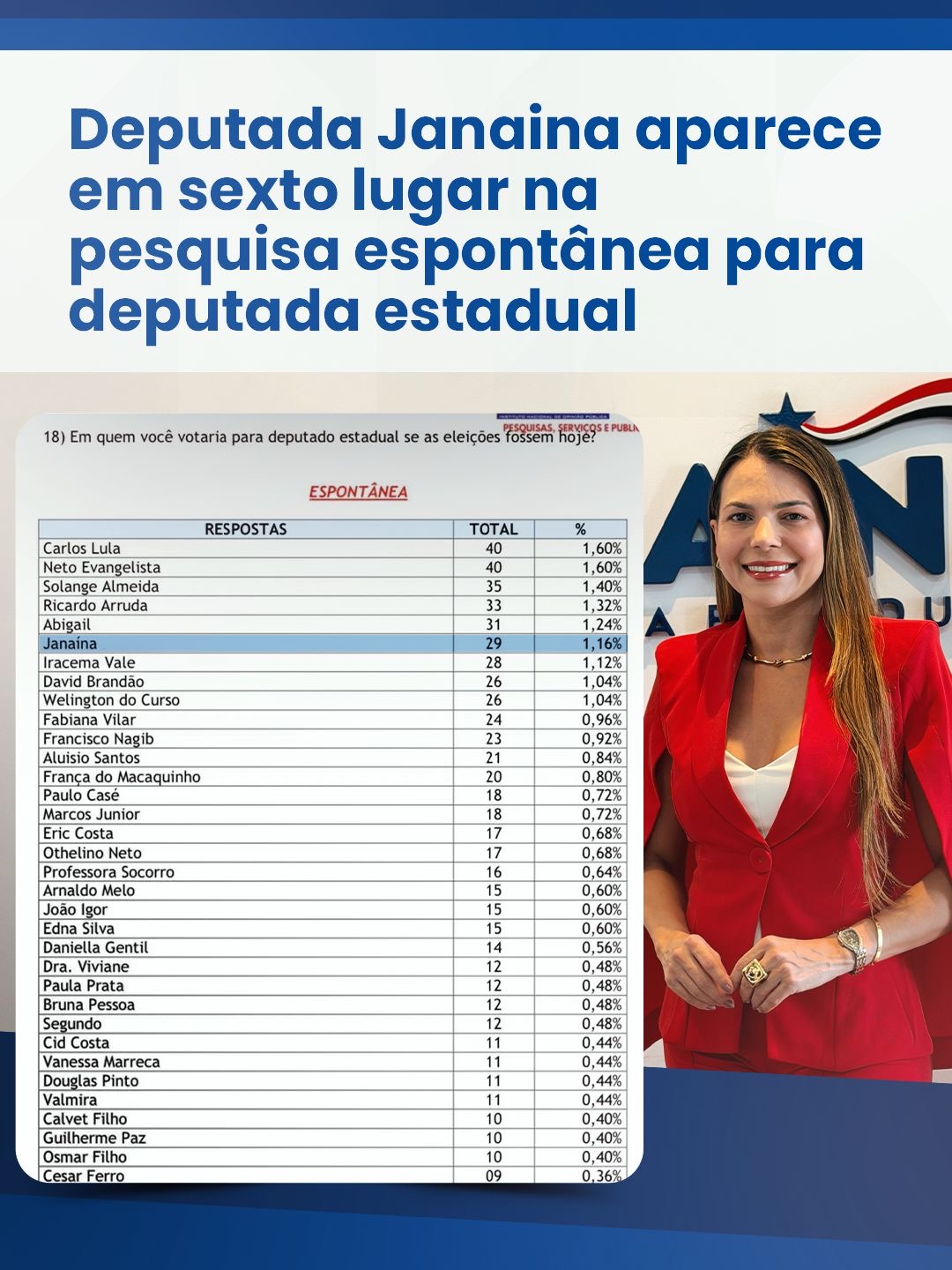 No levantamento, Janaina ocupa o sexto lugar na intenção de voto para deputada estadual. O resultado é ainda mais relevante por se tratar de lembrança espontânea, indicador de reconhecimento, presença política e conexão direta com a população.