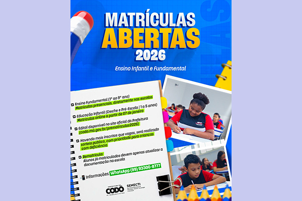 A Prefeitura de Codó, por meio da Secretaria Municipal de Educação, Ciência, Tecnologia e Inovação (SEMECTI), iniciou o período de matrículas da rede municipal de ensino para o ano letivo de 2026. O edital com as normas e procedimentos foi divulgado nesta quarta-feira (07) e prevê o preenchimento de 3.839 novas vagas na Educação Infantil (Creche e Pré-Escola), destinadas às unidades escolares das zonas urbana e rural do município.