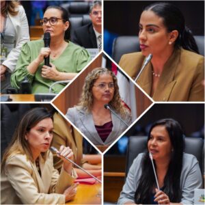 As deputadas Daniella (PSB), Andreia Rezende (PSB) e Ana do Gás (PCdoB), além da procuradora da Mulher da Assembleia, Dra. Vivianne (PDT), prestaram solidariedade à Mical Damasceno (PSD), em apartes durante sua fala denunciando o caso dos prints, na sessão plenária desta terça-feira (20).